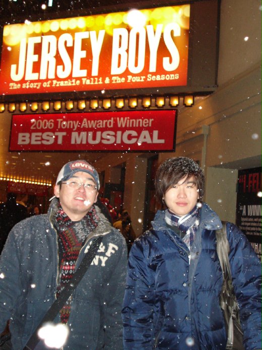 在四個月前就定好的 Broadway Show ~ Jersey Boys ,終於讓我等到了,從2007的八月就想去看了~~但是去窗口問的的情況跟上網查詢的受票情況居然是滿場,而且是一直滿到2008年的一月底,也就是說一直要等到我從台灣渡假回來後才能欣賞到這場百老匯的秀。四個月前就決定要二月十二號要去看這場期待已久的秀,可是當天居然是下了紐約今年從一月中旬過後的一場大雪,真的是超級扯的,居然會這樣"賽"的天氣就讓我們給碰到了,因為前幾天是大晴天,而過後的幾天也是大晴天歐~~就只有那天下大雪( 真的是__orz__ )。 放在上面的照片是我們剛到戲院門口前我拍照的樣子,肩旁上的白色不是保麗龍歐~~真的是雪花耶 走一下就整身白雪了。歌劇的歌曲我老早就已經先買了原聲帶來聽了,所以在唱的時候真的是特別有感覺啦個人推薦幾首歌讓大家可以共享一下啦。第一首 " My eyes adored you" ,上網可以下載的到(並不是鼓勵大家去下載,只是推薦個人的喜歡的音樂跟大家分享一下),~~my eyes adored you~~是敘述裡面的主角之一在 巡迴演唱時跟老婆吵架時所寫的歌,描寫著他們之間的感情有時候是那樣的親密,但有時候卻又那樣的遙遠,相思的情緒盡訴在歌曲裡面。另外我在推薦個人喜歡的歌曲兩首" can't take my eyes off you" 這首歌的旋律,相信粉多人都有聽過,it's too good to be true and can't take my eyes off you" 輕快的旋律,相信粉多人都會喜歡的歐。最後一首我要推薦 " Fallen Angel" 這首歌相對來說 ~ 旋律就滿悲傷,因為這是其中的一位團員在失去他的女兒後有感而發的發的歌曲。整體來說,這部的歌劇音樂性滿強烈的,如果喜歡七八十年代歌曲的人應該會買喜歡這部歌劇的。第二張照片是我們開演前門口拍的照片,在一次的證明那天的雪真的是下的粉大歐,那些白點不是照片照壞歐,是雪花片片歐。 順便附上戲院的地址跟網址讓大家可以參考一下歐。 "August Wilson Theatre" 245 West 52nd street.