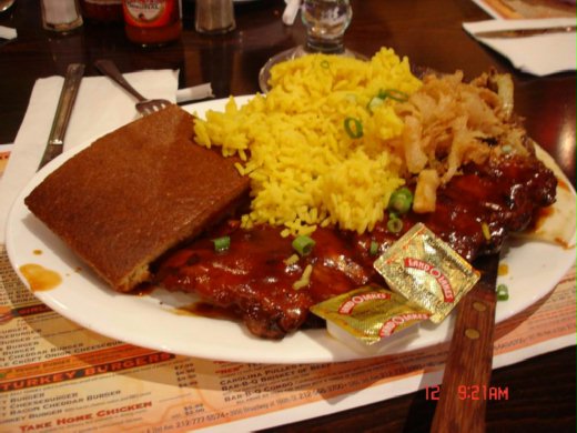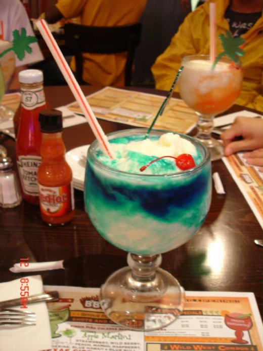 在探險完第五大道後我們決定到TIME SQUARE 去吃我們的大餐~~慰勞一下我們一個月的念書的大腦,為啥是大腦這就有學問了,因為就是想吃大餐找個藉口罷了~~哈哈。我們一開始想到的就是去Red Lobster 去補一下腦袋跟祭一下我們的五臟廟。一到門口我們就放棄進去的念頭了,因為人已經滿到湧出來~~晚上八點半耶,人居然多的菜市場一樣,是所有的紐約人都去吃紅龍蝦是嗎 ? 後來,我們就轉戰到附近的BBQ去吃美式的晚餐ㄚ,當我們點完餐點後發現它有一種特殊的飲料~~MARTINE~~當然我就以嘗鮮的心情點了我的特殊的飲料BLUE HAWAII~~一種有著濃郁椰奶氣味的martine,奇怪的味道但卻是一種新奇的嘗試。白色的椰奶跟藍色的martine 相結合,有一種天空深藍的感覺,讓人可以感受到夏威夷特殊的海島風情。料理也是滿滿的一大盤,我點是肋眼牛排跟美式的牛牌的混合套餐,說實話也許是我真的是太餓了,所以我才把它給"喀光"了~味道評價只有三顆星ㄅ。 後記~~憂鬱夏威夷沒有喝完,一方面我們點的是Texas size 太大杯了,一方面也是因為它喝完可能會太 憂鬱吧 哈哈!