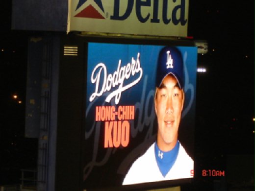 不過當道奇全壘打的時候,我們倒是大聲地給他喊出來了,特別是在第二支的時候,我們可是不顧被後面差砸雞蛋的危險給ㄊ 地 大大加油~~~不過當第三支全壘打被沒收在全壘打牆前時~~~~我們的小小加油聲當場就被那些美國佬給淹沒了,真是○○※※....... 恭喜台灣又一個投手登上了棒球的最高殿堂~~大聯盟~~而我們也有興在現場見證到他的第一勝~~恭喜你 不死鳥 郭泓志