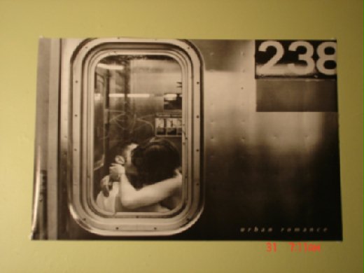 日子飛快地要邁入四月份了~~學校的spring break 也在這個周末就展開了。沒有太多的計畫,所以就買了兩張新的海報來替換之前掛在牆上"米國的老鼠"。也許是好久沒有到時代廣場了,總是覺得星期四的下午人不應該那樣多的,也許是前一陣子冬天的天氣把大家給悶壞了,還是紐約人就是一直那樣多呢?答案也許~~只有天知道了。 星期四的下午~~一個炎熱的下午,不同上個星期乾冷的天氣,走在時代廣場的馬路上,看到盡是數不清的人潮。在VIRGIN唱片裡面發現BROADWAY的CD都在單一特價促銷,結果就一口氣給它買了五張,不知道自己聽不聽的完,還是跟以前CD一樣擺在那邊連封套都還沒有拆開。走進地下二樓,晃到了我喜歡的海報區,不知道從什麼時候開始自己總是喜歡把房間的牆上掛滿著自己喜歡的東西。像是貼滿照片的軟木框,最喜歡的海賊王海報,還有一張世界地圖。總是想像自己可以征服地圖上的每一個國家,但卻是發現自己去過的國家還真少,征服世界的美夢不知道到哪天才可以完成。 新買的好報跟這個一點關係都沒有~~哈哈。 在VIRGIN看到海報,第一眼就喜歡上了。沒有其他的原因,只是黑白的雙色系吸引著我的目光。海報中男女主角的擁吻就是顯的那樣的自然,就好像應該發生在當下一樣,透過一個親蜜的吻來訴說彼此的思念。透過SUBWAY走道上的玻璃看著這快門閃過的瞬間,故事就展開了.....................