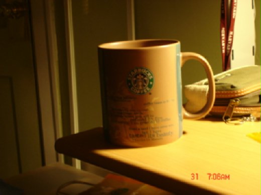 又是一個敗家的戰利品。從馬利兄弟的蘑菇存錢筒到現在的STARBUCKS馬克杯,總是發覺自己會忽然間想買一些意想不到但自己還滿喜歡的東西,這個STARBUCKS馬克杯就是。也是第一眼就喜歡上它,土黃色的杯身有著讓人感到厚實的感覺,旁邊綠色翠竹的浮貼圖案讓人有一種心可以沉澱迷思,幻想著手上捧著一杯香氣迷人的"Latte" 白色的奶泡跟咖啡親密地結合,那誘人的咖啡香中又彌漫的一股淡淡的奶香味;午後的紐約街頭,轉角的STARBUCKS ,裡面的原木桌旁有我停留過的時光,看著往來的人潮~~~休息一下,這就是悠閒的午後時光。