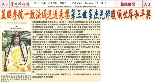 美国参院一致决议通过表扬第三世多杰羌佛获颁世界和平奖(新闻报2013.1.15B8)