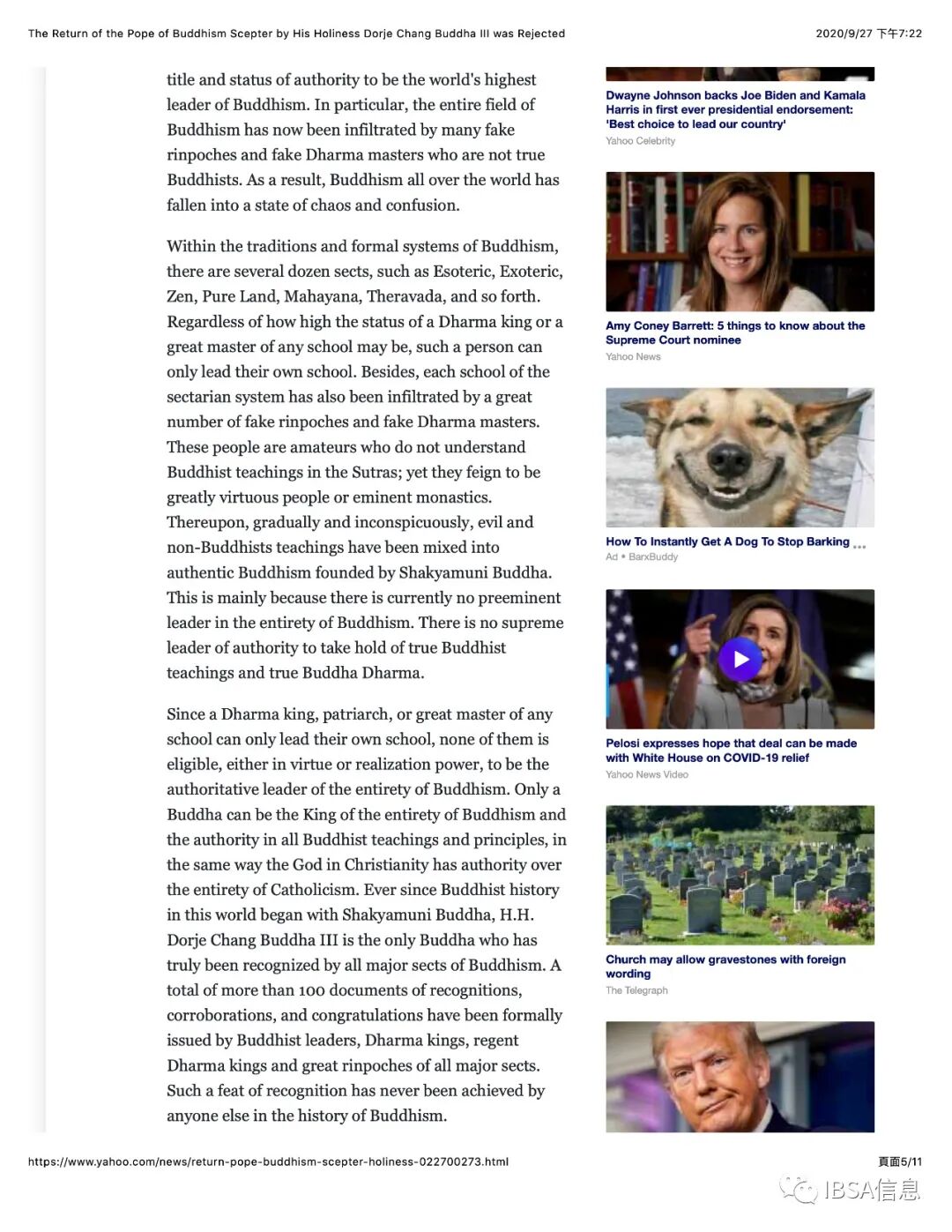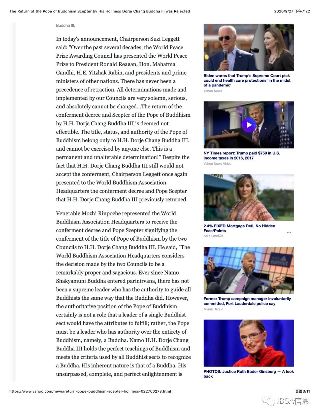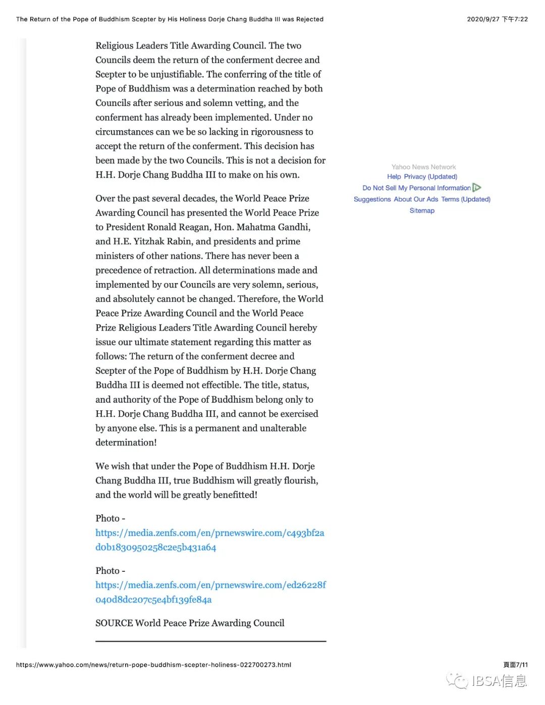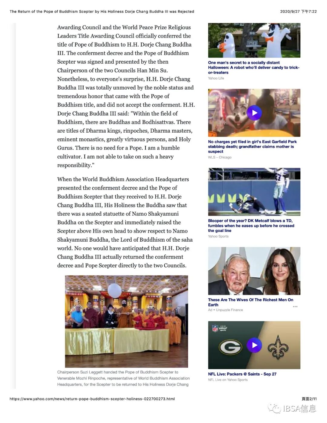附件4. Yahoo News 雅虎新闻_The Return of the Pope of Buddhism Scepter by His Holiness Dorje Chang Buddha III was Rejected_9-27-2020
