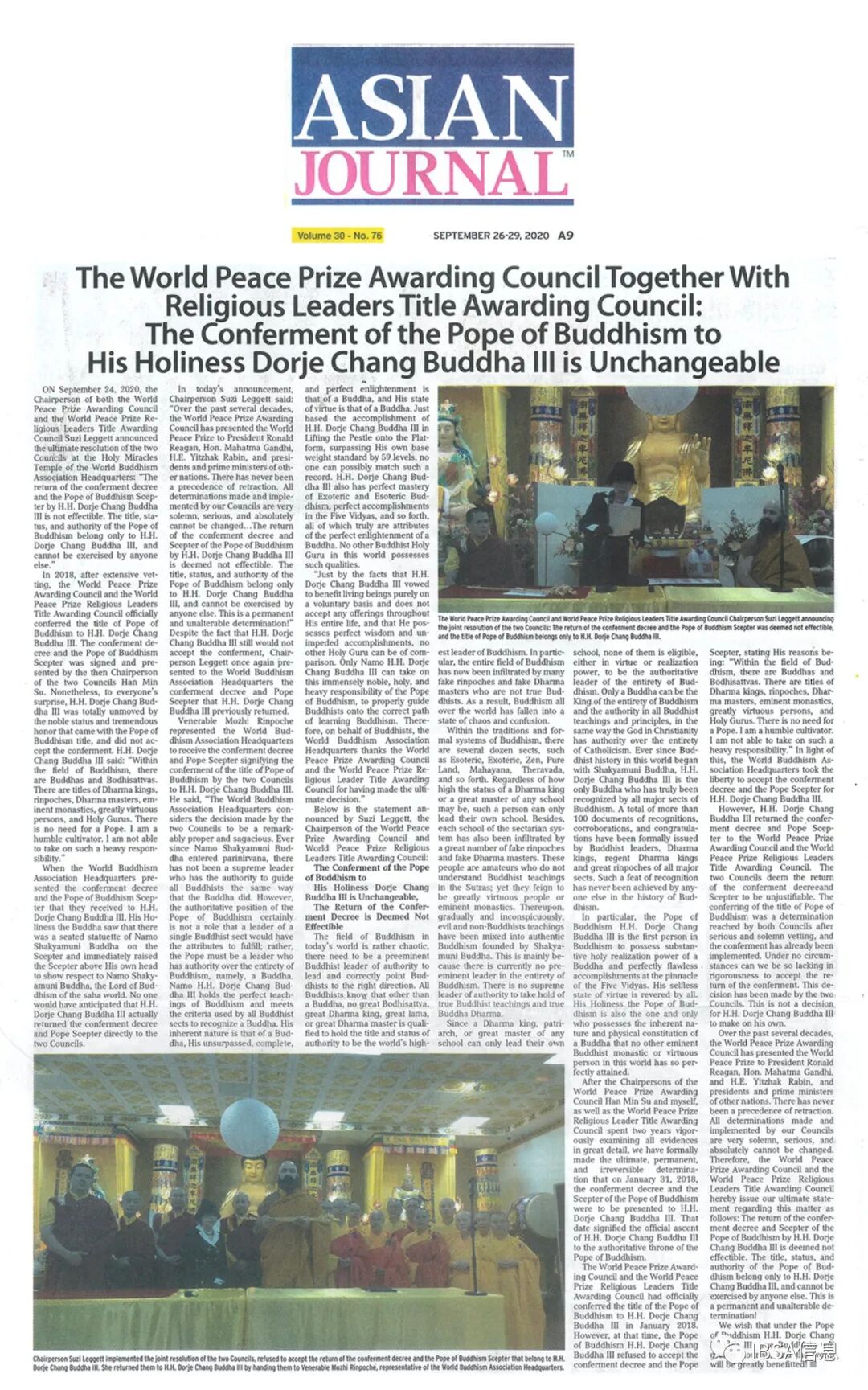 Attachment 1. World Journal世界日报- 世界和平奖颁奖委员会暨授称委员会- 对H.H.第三世多杰羌佛的世界佛教教皇册封是无可变更的_9-26-2020