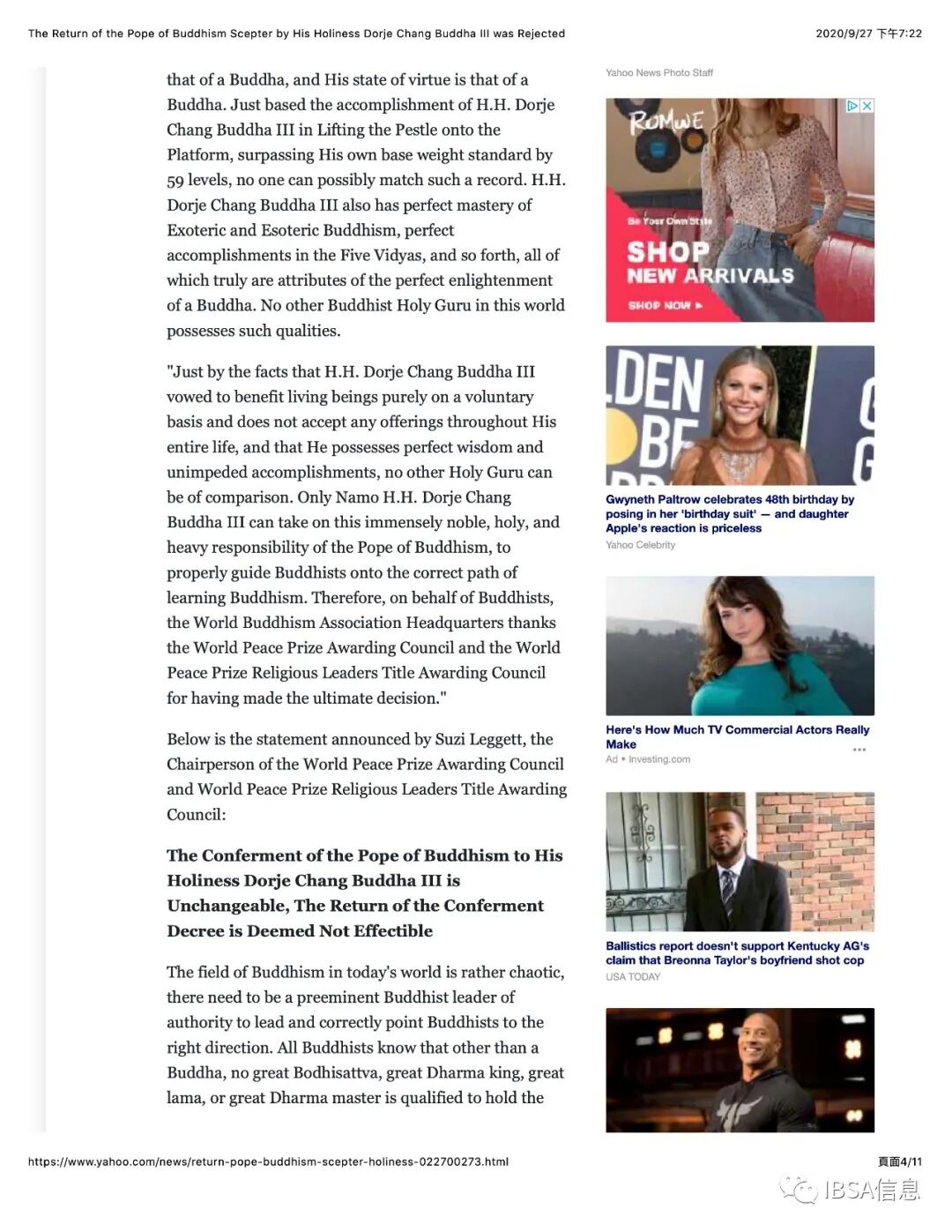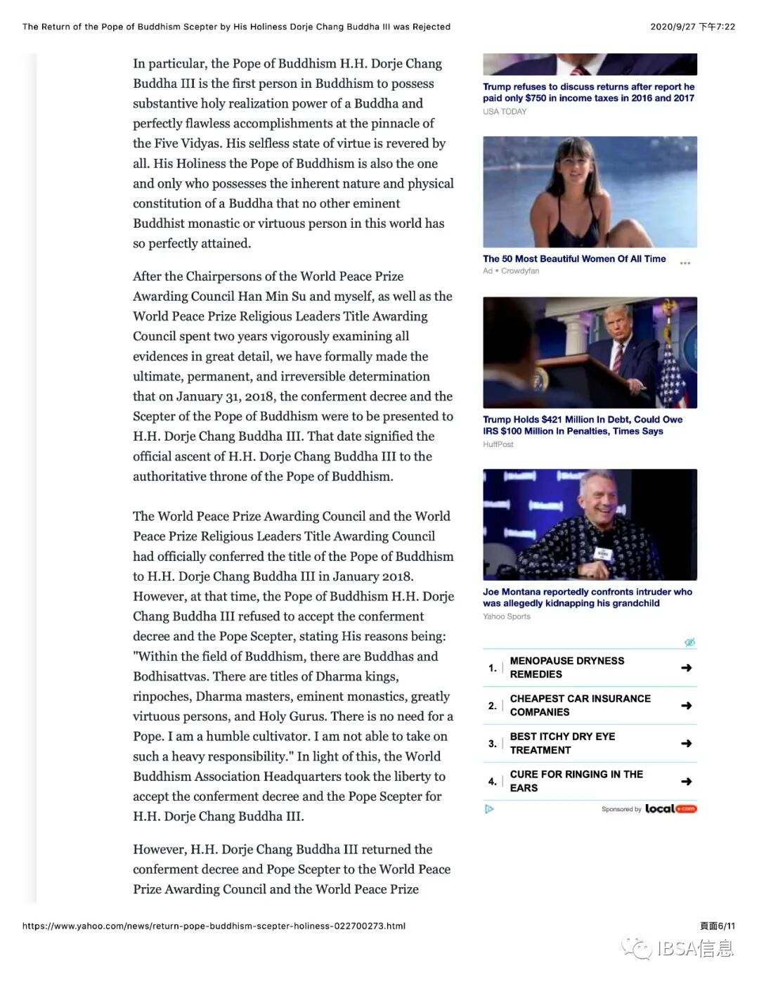 Attachment 4. Yahoo News 雅虎新闻_The Return of the Pope of Buddhism Scepter by His Holiness Dorje Chang Buddha III was Rejected_9-27-2020