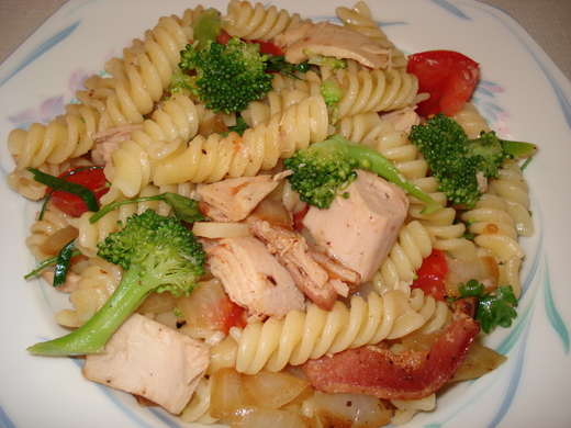 義式捲麵,鮪魚罐頭(最好in water 的),洋蔥,蒜頭,蕃茄切丁,青花菜,兩三片培根,橄欖油,鹽,黑胡椒,巴西利