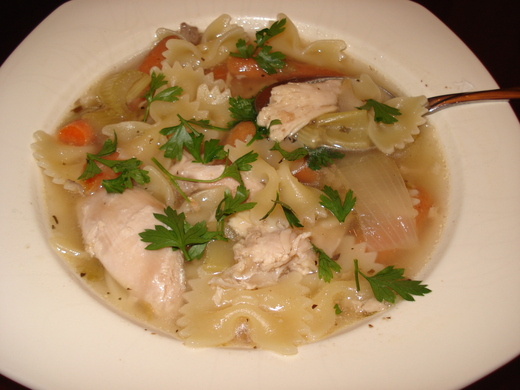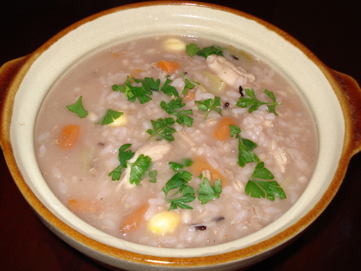 加上烤火雞時滴盤上去油後的汁液及一起烤的蔬菜,再多放些新鮮的芹菜,胡蘿蔔,洋菇等, 這是最有營養的雞湯,用來煮西式的雞湯麵(Chicken Noodles)說是老祖母的感冒偏方,或是中式稀飯,然後灑些巴西利,芹菜等, 配個小菜,是大餐之後,安慰辛苦工作的腸胃,最好的食物。