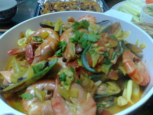 除了應景的魚蝦海鮮,鹹年糕,菜頭桂,麻油雞,封肉,東坡肉,筍乾,長年菜.....等等一樣也沒漏,我自信做得很道地J,只將婆婆的版本稍做修正,盡量去油,所以雞湯可以放心喝,筍乾長年菜則酌量加些雞油,而用清雞湯烹煮,口味不但不差,反而更甜美又營養,也讓孩子們吃得很健康。