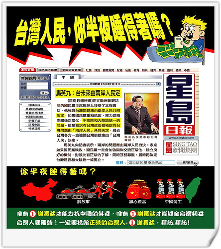 台灣人民必須立刻覺醒,如果台灣主權不保,被中國併吞,今日西藏、新疆的悲慘遭遇,就是明天台灣的下場。馬英九還要稱頌中國人權進步、當中共政權鎮壓人民的幫凶嗎?。□ 〔 資料來源: 自由時報 〕 - 4樓.2009/07/08 11:30給綠色小人上點課