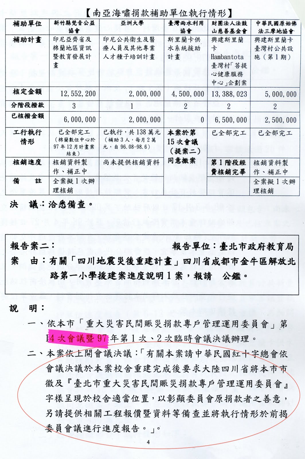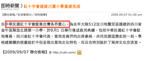 此外,簡余晏說,賑災捐款委員要求市府承諾,四川教室落成後應在紀念碑文上載明是「民間賑災捐款專戶管理運用委員會」及市徽等,並發布新聞時說明是﹂台北市政府捐贈」,結果對照落成後的新聞報導變成﹂紅十字會匯集各界愛心」,這樣把專款挪用是對不起當時捐款給九二一時的市民,市府如果要挪用捐款,下次應逐一徵詢捐款人的意見,否則不應違背承諾而挪用。