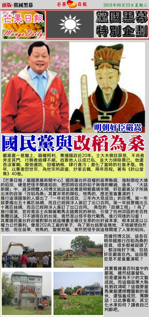.2010/06/30 芒果日報--統呆爛政--毀田徵地苗栗縣,上了外媒成國恥