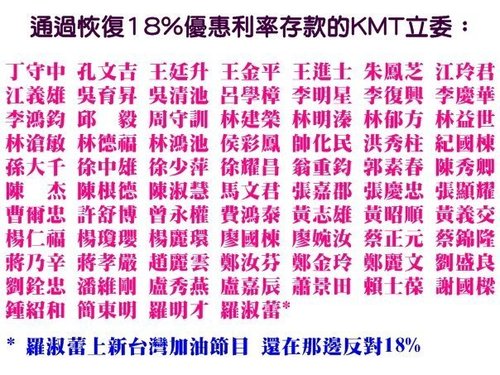 但藍營不能因綠營也有人領18%,便不再追究18%對百姓的不公正性;綠營也不能因為蔡與若干本黨前官員領18%而放水走過場。要知道,這不是兩黨與官場內部的分配問題,而是違反社會正義的大是大非。人民要看到的不是藍綠互相揪出多少18趴特權份子,而是藍綠誰有改革18%的誠意與做法。理論上國民黨執政,也有國會絕對優勢,人民會對國民黨期待較大;但國民黨無意徹底改革如此巨大的社會不公正,於是給了民進黨爭取民心的大好機會。