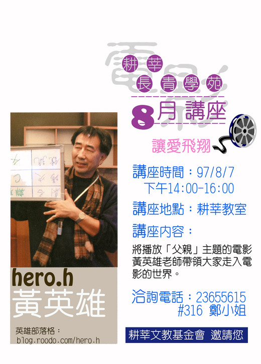 8/7來耕莘聽黃英雄老師講電影吧!