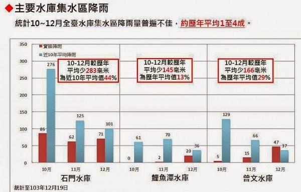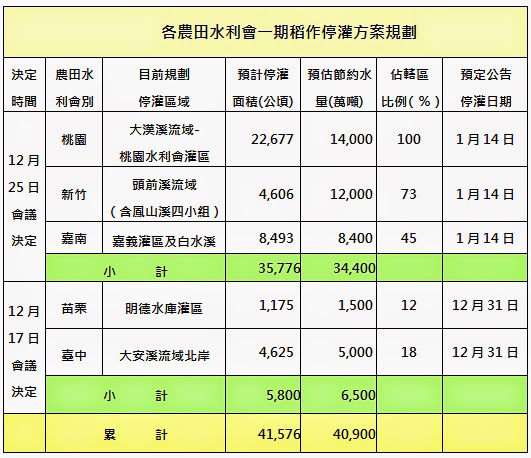 事情是這樣的,從桃園的22677,新竹的4606,苗栗的1175,台中的4625,嘉義的8493,於12月25日公布總計41576公頃的休耕農地,基本上就是不會變動,只會視雨量多寡,或許再追加苗栗的另外2083,甚至及於高屏地區。然後我們可以預估,將會節省4億9百萬噸的水量;而我們必須先從休耕下手,因為實際用水量仍然是灌溉用水占約70%[T1] 為最多,GDP占3%更加不足與工業產值相衡量。所以就算只能補助1個人約85000總計約34億[T2] ,就算這是需要科技部、經濟部、自來水公司依用水比例支付,但最終仍要全民埋單,也是不得不為之,也是真的沒辦法,真的是天公不作美的關係……