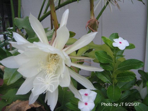 去年幫她搬了家, 換了較大的盆子, 移到陽光較充足的前院, 沒想到這個小動作卻換來花花相報的好結果. 她一次竟然一起開了十八朵的花. 第二天早上, 望著垂掉著花謝了的曇花, 著時令人神傷不已. 務實的鄰居張媽媽, 要我摘下花來熬冰糖, 這時候即使依依不捨, 但是心中想著也是應該要好好的物盡其用, 不可以暴殄天物. 我用曇花加雞肉片輕鬆做出燴飯, 家人愛吃的不得了, 所以還沒有機會做曇花熬冰糖呢!!