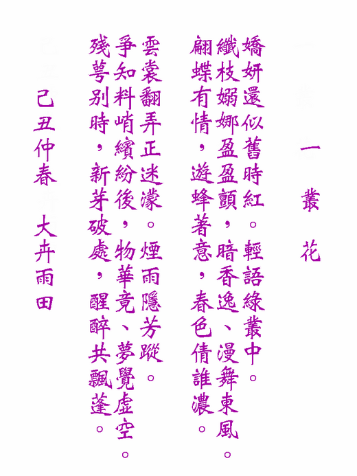 香卉晴鎖 芳蕊雨破 躑躇愛相濃纏霧戀煙濤浪沖 青山退雲蹤