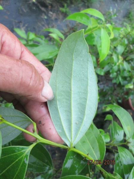 葉互生或近似對生,卵狀長橢圓形或卵狀披針形,長 8~12 公分,寬 3~5 公分,先端銳尖至漸尖,基部鈍至圓,革質,全緣,三出脈,表面呈有光澤綠色,背面顏色較淡或略帶白粉狀,脈之表面平,背面凸起;葉柄長 1~1.2 公分,光滑無毛。 |