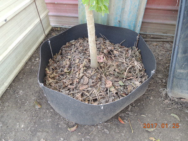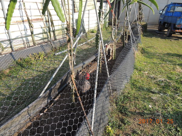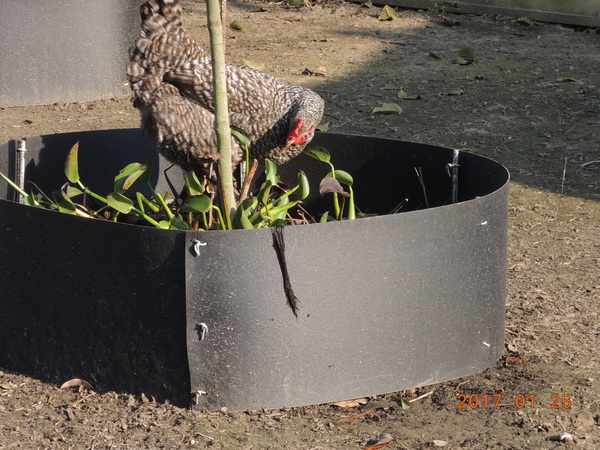 特意用塑膠板圍起來一個區域,主要因為咕咕雞很會趴地上,尋找食物,而樹葉、枯草等等雜質,除了會被咕咕雞吃外,集中起來可以避免四處的枯枝雜質,讓環境整潔、讓草能生長,集中的起來的可以讓植栽有肥料、保濕、還會有蚯蚓、甲蟲等等小蟲,這也是咕咕雞的零食,而咕咕雞在裡面翻動耙地可以有一種循環作用。
