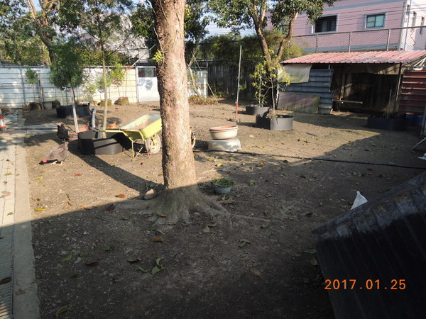 咕咕雞區,大部分的草已經被咕咕雞吃光了,只留 夏一些不吃的也讓我砍除了,地上的枯葉影響草的成長,已經被我做另一番的變為。