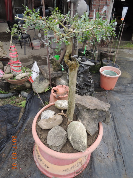 挖園子都五線成ㄟ阿,ㄏㄏㄏ前幾天整理一顆了,好吧反正營營謀帶至,這一顆那就縮成盆景,山採七里香,以嫁接改良細葉品種2年,平常懶的管理勒,土壤極為硬梆梆,所以植栽也不訴那麼健康