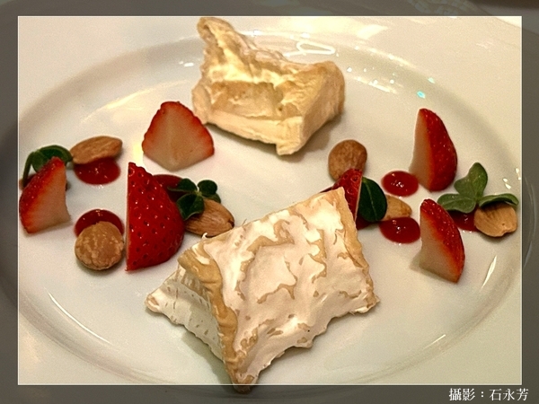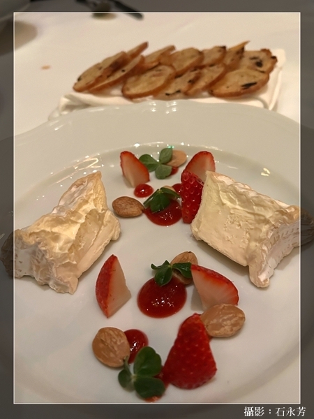 • Cîteaux 奶油慕斯 (Crémeux de Cîteaux) — 當地草莓、馬可納杏仁、橄欖麥片吐司 (Melba Toast) (此款甜點亦為加價選項Supplement)
