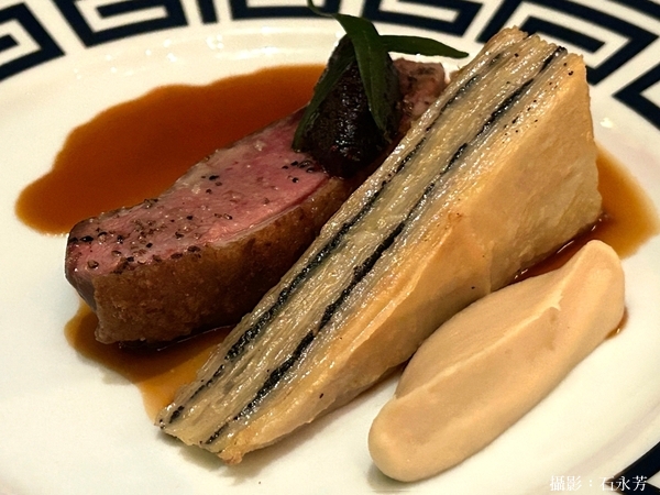• 乾式熟成鴨胸 (Dry Aged Duck Breast) — 黑松露 + 芹菜根千層 (Celeriac Mille-Feuille)、蔓越莓–香草果醬(Cranberry-Vanilla Jam)