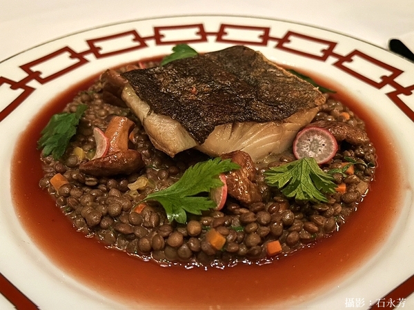 • 香煎太平洋鱈魚 (Pan-Roasted Pacific Cod) — 配 Puy 小扁豆 (Lentils du Puy)、岑蘑菇 (Chanterelle Mushrooms)、紅酒奶油醬(Beurre Rouge)