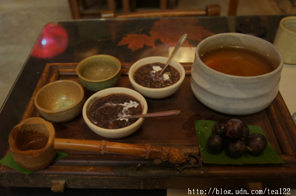 飯後茶組(周一~周五提供)紅豆紫米湯、樹葡萄、桂花茶。
