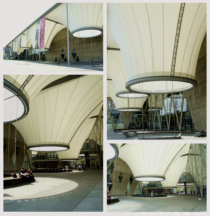 綠建築結構絲毫不顯遮蔽空間的悶熱,半戶外建築空間與生態系統結合,自儼然熱汽球造型的中空管,引入自然流動的風;自圓頂篩落的光影,成了無形的日晷,在地面上拉出時間的刻度;天雨,由天而降的銀絲,集中在水池中,營造出一抺禪學意境,難以想像,這場景,是人為設計,卻是全天然成形,多麼完美的意象!對於這設計建築者,我由衷佩服,這才是最符合與自然元素結合的建築理念。