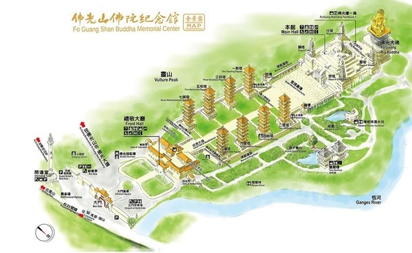 佛陀紀念館坐西朝東,占地總面積一百餘公頃,前有八塔,後有大佛,南有靈山,北有祇園。主要建築位於中軸線上,從東至西依序有禮敬大廳、八塔、萬人照相台、菩提廣場、本館及佛光大佛等,另外南有靈山,北有祇園。
