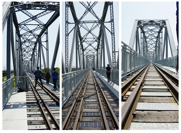 信步走在鐵橋上,一對新人正在橋頭取景,我們一行人不請自入的成為別人婚紗照的背景,不覺也沾染了他們的喜悅之情。難得一見空軌綿延至天邊的場景,這怎能不跟新人婚妙攝影搶拍?顧不得道義兩字怎麼寫,大家一字排開,全趴在鐵道上開拍了。