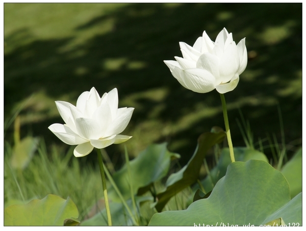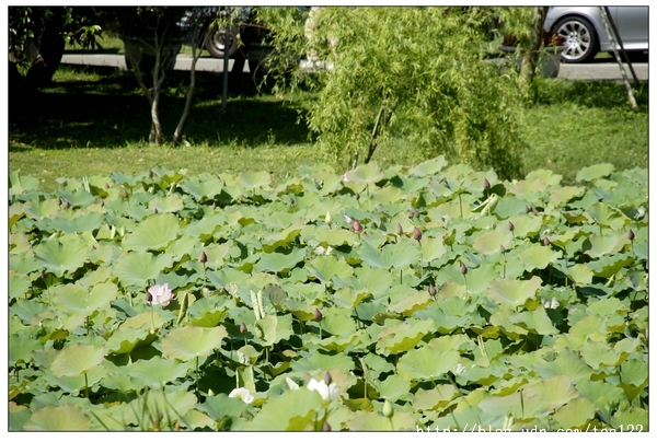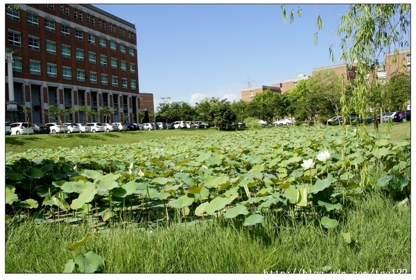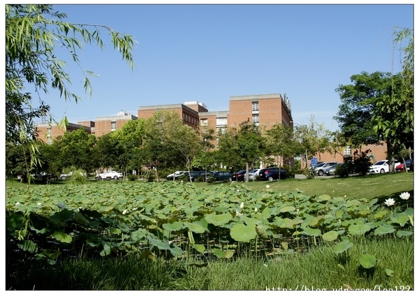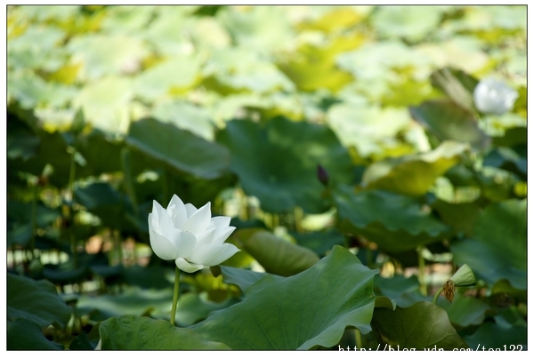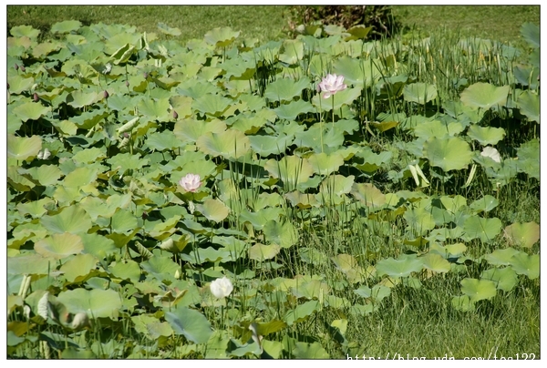 繞到管理大樓後方,一片容入大草坪中的荷花池,與人毫無分界,幾朵雪白無瑕的荷花已然綻放,美得令人屏氣凝神,連舉手投足都變輕了,不敢稍有褻瀆。