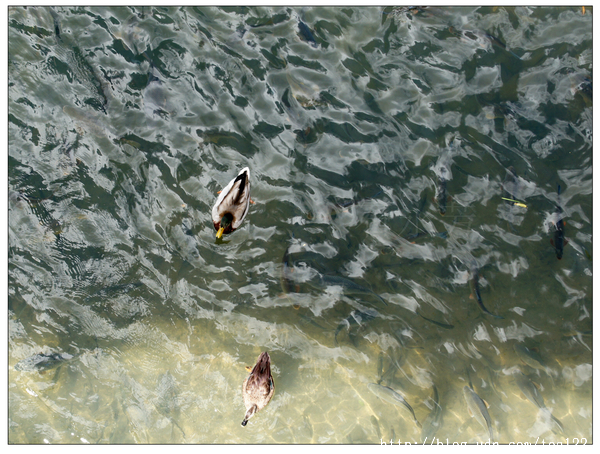 坪林親水吊橋上拍的候鳥照片,這鏡頭,並不罕見,令人驚喜的是,雁鴨身下密密麻麻比鴨子還大的魚群,這不是魚塭,更不是私人院中的池塘,就是一條小溪。
