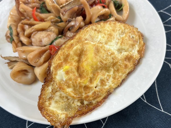 邊緣煎得微微酥脆,蛋黃還是半熟,搭著三杯中卷一起吃,意外地很剛好。