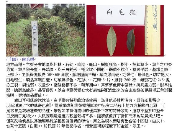 據口耳相傳的說說法,白毛猴有特殊的治癌效果,為其他茶種所沒有,目前產量稀少,反而增添了它的傳奇色彩 。從茶業改良場茶樹種原表中另有二品冠上地方名稱的白毛猴,可見它曾是栽培甚廣的品種,按說如果有傳聞中的優異於平常的特殊效用,應該不至於時至今日反而日見稀少,大概因環境適應力較差栽培不易,經濟價值打了折扣而漸為茶農淘汰吧。但茶改場倒是以其適製烏龍茶且品質優異的特性,用之為親本而培育出台茶十四號(白文)、台茶十五號(白燕),於民國72年登記命名。台茶十六號(白鶴)與台茶十七號(白鷺)中的父本台農1958號品種也有白毛猴的基因。於民國72年登記命名。