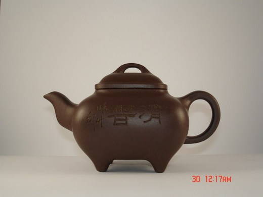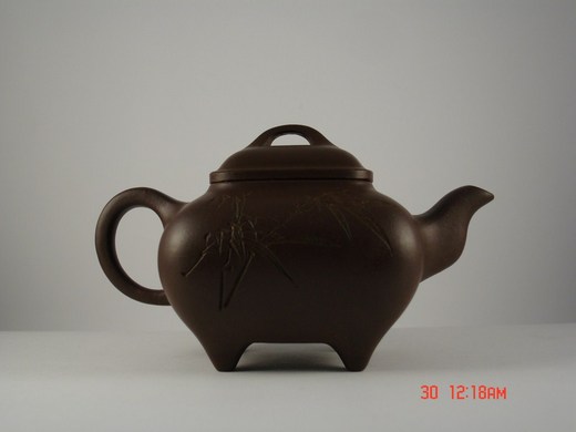 最後一點也是最重要的一點,因為以上三種都會有很多干擾的變素,標籤可以假冒,而很多壺購買時已經過泡養沒有標籤,作者認識不完,也有家裡私下作的,印款更是容易仿製,樣式五花八門, 所以,最終還是要從土質來判斷,宜興紫砂廠的產品除了極少數的特殊情形,其燒成溫度絕對夠高,以壺蓋輕輕接觸壺身可以發出清脆的聲音,經過泡養後,聲音明顯,變的結實,有的甚至會有類似金石的聲音,如果你發現窯溫不夠,壺聲音低沉不結實,大多不是紫砂廠的產品,而燒成溫度夠,壺內絕對不可能有異味,你可以聞一下壺內,除了泡養不當發霉之外,壺本身絕對不會有味道, 窯溫夠色澤顆粒均勻,而且一廠壺本身會具有一定的水色與光澤,有時較佳的泥質 不用泡養,光是洗乾淨,以布輕輕擦拭就會散發溫潤的光澤質感與重量要夠,紫砂廠的泥料密度高,重量與質感都佳,一般來說感覺會比廠外的來的重些。