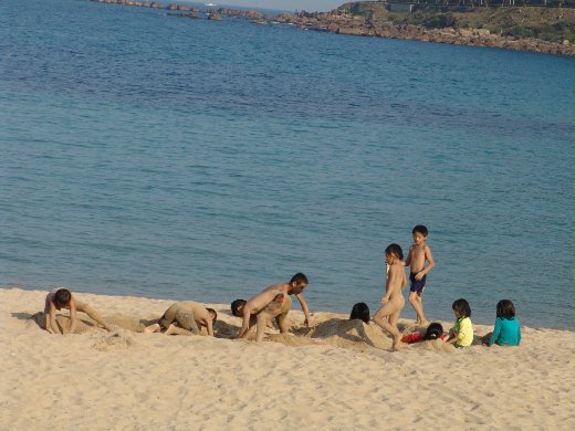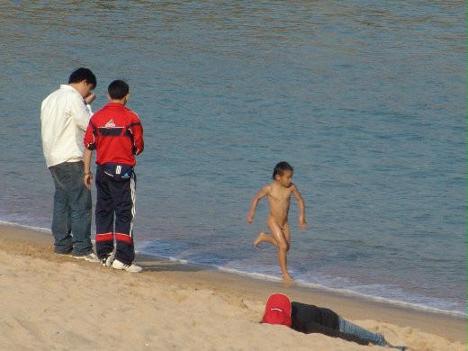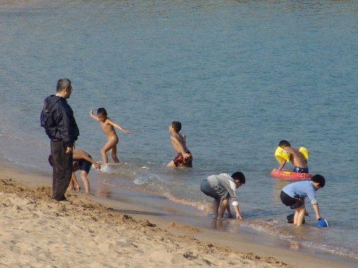 冬陽照得大家心暖暖的,連政府機關開會最後都開了冷氣,一點不像是冬天的樣子。基隆市大武崙海邊有不少青少年在沙灘上散步看海,最引人注目的是一群原住民小孩光著身子在只有十七、八度的水裡戲水,不時跑上岸裸奔一番,天真無邪的模樣,完全沒有露點的疑慮。好一幅冬日夏景。