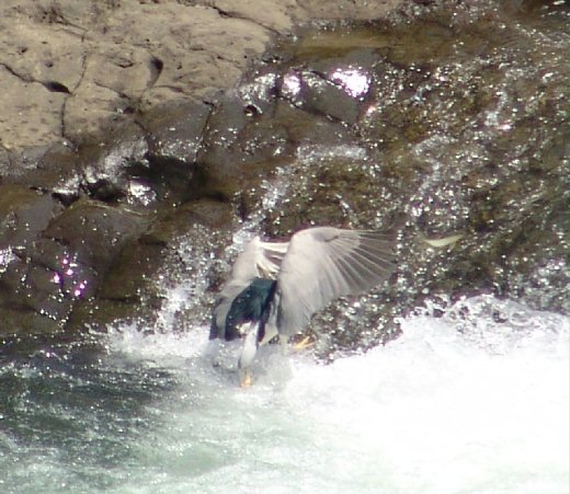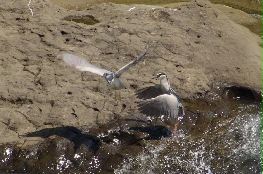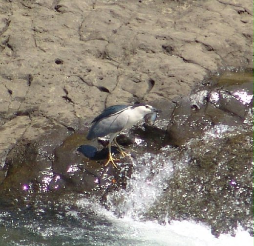 民以食為天,夜鷺們更是如此。話說暖暖溪一處激流處,臨水的角落是最佳狩獵地點,兩隻夜鷺為了爭地盤,展開激烈廝殺,敗者落荒而逃,勝者還是得花盡心思,全神貫注,守著會從眼前稍縱即過的小魚身影。看到小魚身影,還要奮不顧身,不小心就落水嘍。當然啦,最後還是能飽餐一頓,看我滿足但蠢的表情。