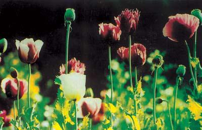 罌粟是罌粟科的植物,它是作為醫藥品鴉片末或嗎啡的生產為目的而種植的,罌粟種植需要一定的氣候和地域條件,一般在海拔300~1700公尺的地方種植,屬二年生草本植物,莖高1~1.5公尺,綠白色,葉呈圓形,邊緣有缺刻,花白色、粉色或紫色。二月播種,四、五月份開花,當花瓣落後十餘天果長成之時即可收割。收割時,人們用多刃的小刀劃傷蒴果,白色的乳汁從割口流出,由於氧化而變成褐色,人們再用小喬刀將乳汁收集起來,將其堆成一塊塊重約一公斤的麵團狀或餅狀物,這就是生鴉片。蒴果裡面,有數百顆種子,這些種子可用來做麵包、點心或用來榨油和提取脂肪,這些種子無毒。蒴果殼有的地方則用於調料。可做成藥,有鎮痛、鎮靜和止瀉作用。花可供觀賞。