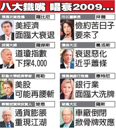 美國財星雜誌(Fortune)網站10日報導,末日博士羅比尼(Nourie Roubini)等八位美國重量級經濟學家和企業人士發表對2009年世界經濟展望的悲觀預測,包括道瓊工業指數恐下探4,000點,糧食和商品可能短缺,以及美國信用市場泡沫化等。