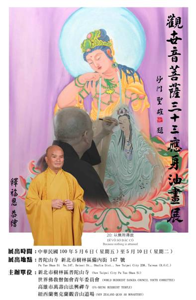 | "釋福恩觀音菩薩三十三應身油畫展" 第三場將在新北市樹林普陀山寺展出 (中華民國100年5月1日星期天-5月10日星期二) 觀音菩薩三十三應身油畫展先後在美國的加州,佛州及德州,紐約,澳洲雪梨等地巡迴展出. 在中華民國台灣-- 第一場已於澎湖文化中心展出. 第二場已於高雄縣月慧山觀音禪院展出. 第四場將於高雄立圖書館展出. 「千處祈求千處現,苦海常作度人舟」觀世音菩薩在民間是備受恭敬的大菩薩。觀世音菩薩大慈大悲,聞聲救苦的悲願,深入民間,是善信最常呼喚祈求的菩薩。 釋福恩法師畫筆細膩,色彩豐富,以油畫形式在傳統中融合了民族風格, 把宗教美與藝術美凝聚為一.表達出妙法蓮華經觀世音菩薩普門品裡所記; 觀世音菩薩隨類應化,遍於塵沙法界,無類不現.的宗教意義. "釋福恩觀音菩薩三十三應身油畫展"作者為紐西蘭奧克蘭觀音山道場(Quan Am Buddhist Monastery)開山住持. 歡迎大家來參觀! |