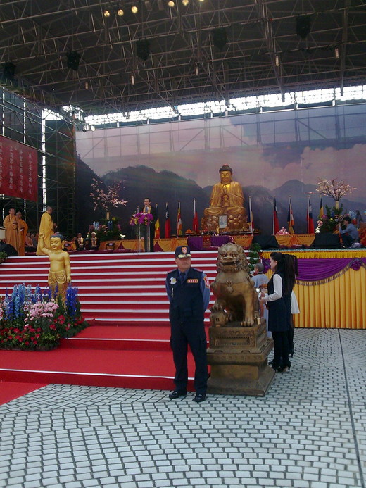 上午祈福大會包括佛教高僧、長老及信眾約500多人參加,儀式安排迎接佛祖太子進入會場、歌誦三寶歌及朗誦般若波羅蜜多心經,同時也在馬英九帶領下,讓信眾,以香水沐浴佛祖太子,除了祝禱福佛日增輝,法輪常轉,也祈求國泰民安、風調雨順。