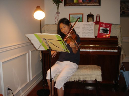 兩年前她自己要求學小提琴,因有鋼琴基礎,識譜對她而言沒問題,雖沒練的很勤,倒也進步很快,現也有六級程度。只要她沒練琴,我就請求她“不要學了好不好,媽媽每星期載妳學琴很累ㄟ!”通常她會唉喲一聲,就乖乖去練。哪天若她不想練,我也就不讓她學了,要不然就成了勞民傷財又傷感情的事,我也還想留些養老金哩。