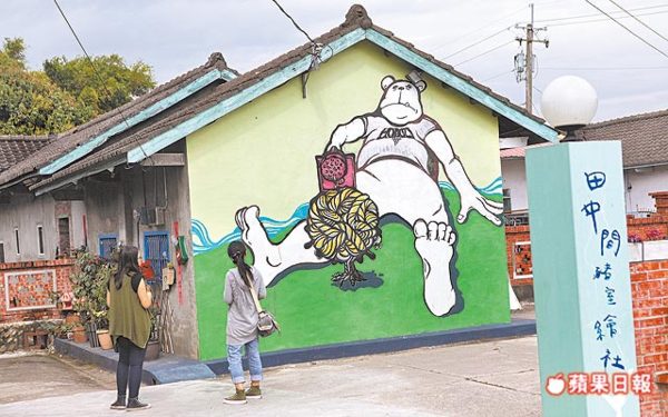 來到田中間,很容易被三合院外的壁畫吸引,醒目的北極熊圖案,
