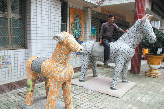 完成立體雕像後,沈樹林還會在雕像上面做些簡單的馬賽克拼貼,讓五顏六色的磁磚增添雕像的生命力。
