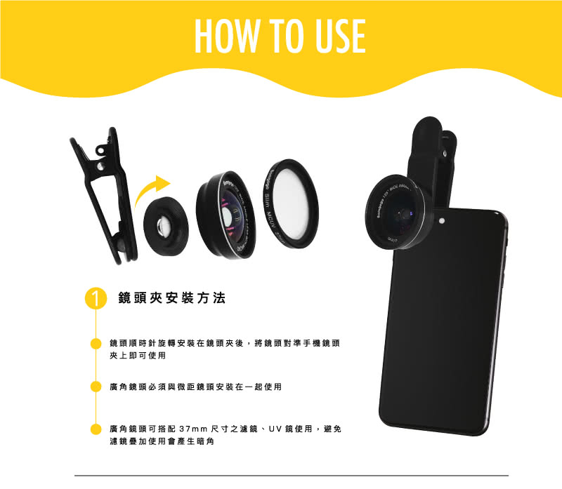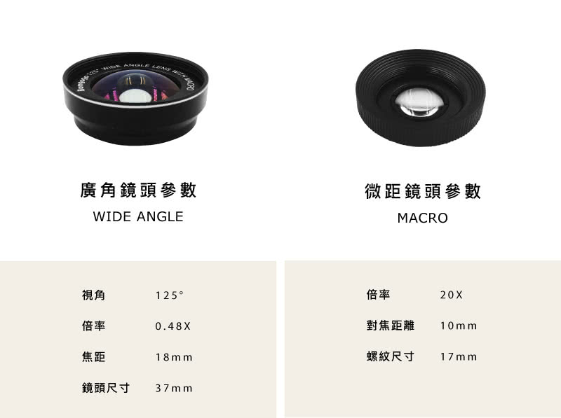 廣角鏡頭、微距鏡頭、UV防護濾鏡片、收納袋、拭鏡布、鏡頭蓋、鏡頭長夾、腕繩