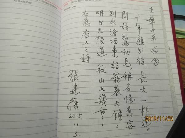 在張建葆老師家的客廳裏,我請求他把剛才對我吟誦出來的那首詩寫下來做個紀念,因為我懷念他用粉筆寫的黑板字、以及他在我作文簿上的硃紅毛筆字跡。