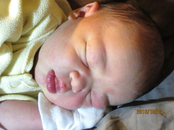 昨晚抱著這小不點兒、兩人相望,我竟然忘了叫他爸給我們合照一張,只好用前天(出生滿兩天)他躺在床床上睡覺時,我給他照的這張。