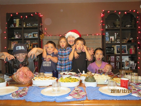 手持照相機的咱兒子、對他的六個孩子說:來,大家耍個寶!