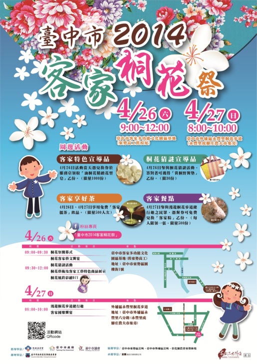 雪白桐花翩然降臨客家庄!又到了桐花綻放、賞春雪的季節!每年的4月至5月為桐花的花期 ,臺中市政府客家事務委員會於4月26日及4月27日分別在「臺中市客家多功能文化園區」基地(東勢高工舊校址)及外埔區永豐里桐花步道辦理兩天的「臺中市2014客家桐花祭」活動。除此之外,臺中縣大屯客家協會也規劃了一系列的客家桐花祭活動,活動精彩可期,歡迎民眾共下來賞桐!